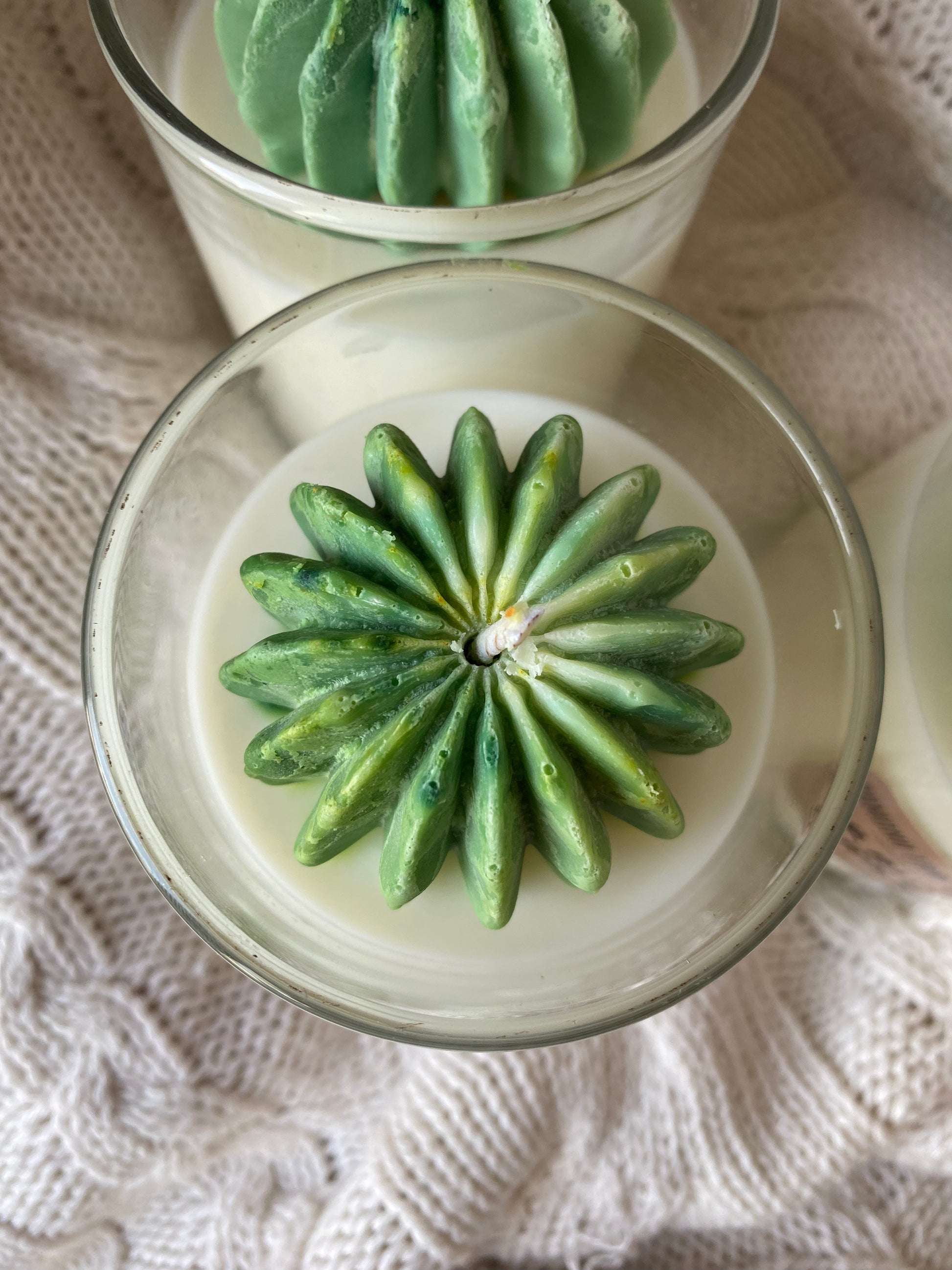clean-burning natural soy wax candle. features a cotton wick with a green succulent and white base made 100% with natural soy wax.